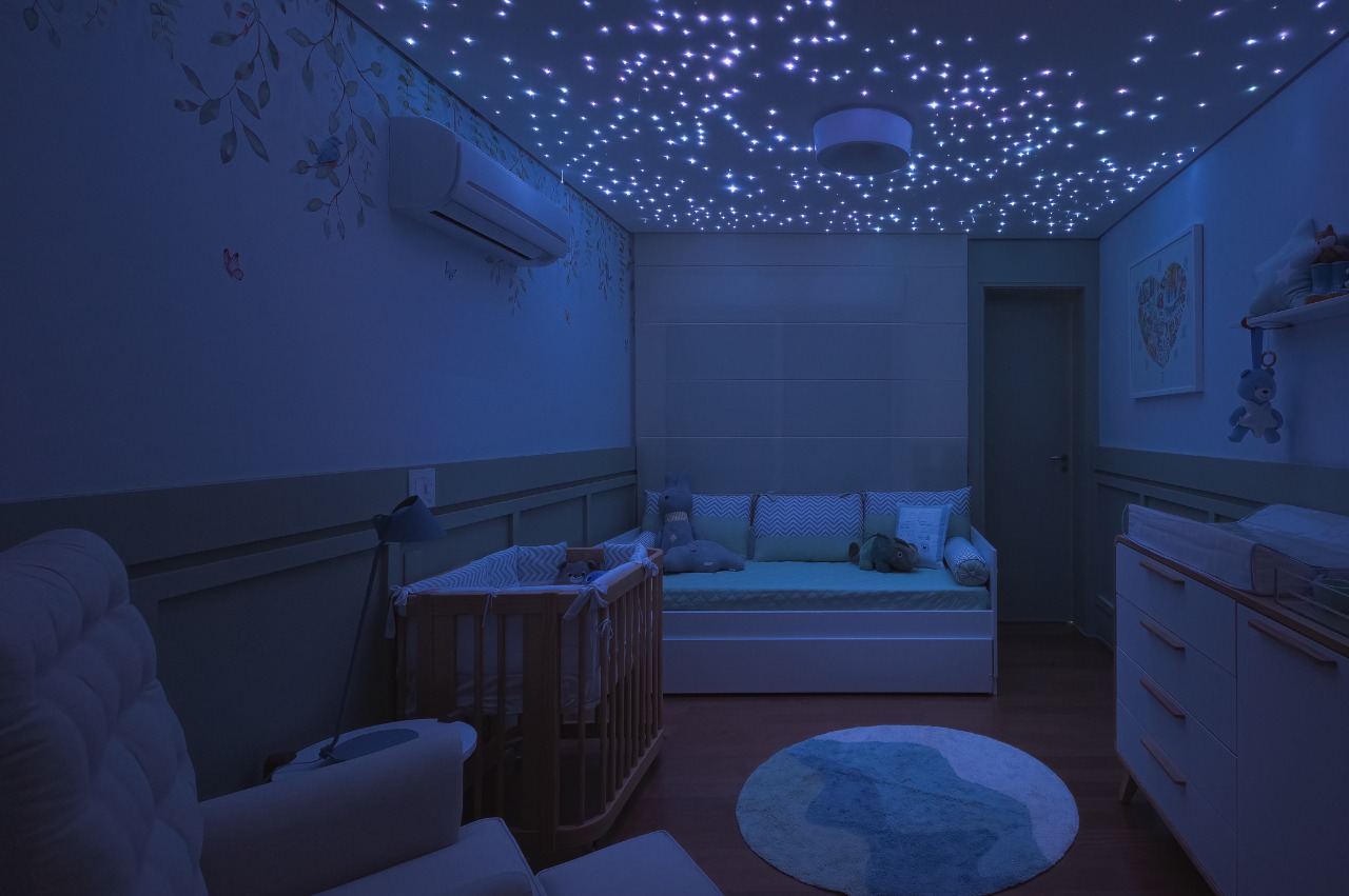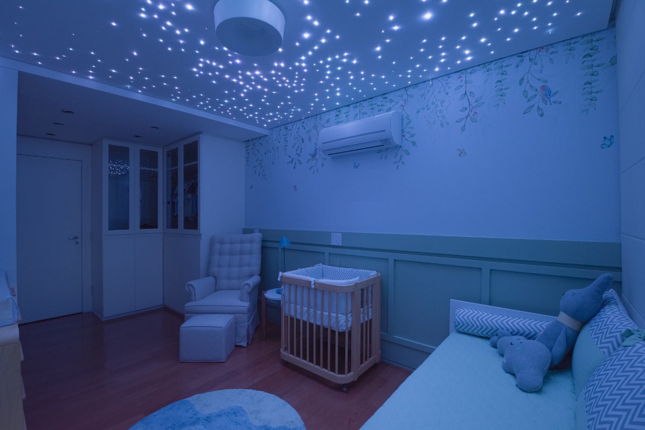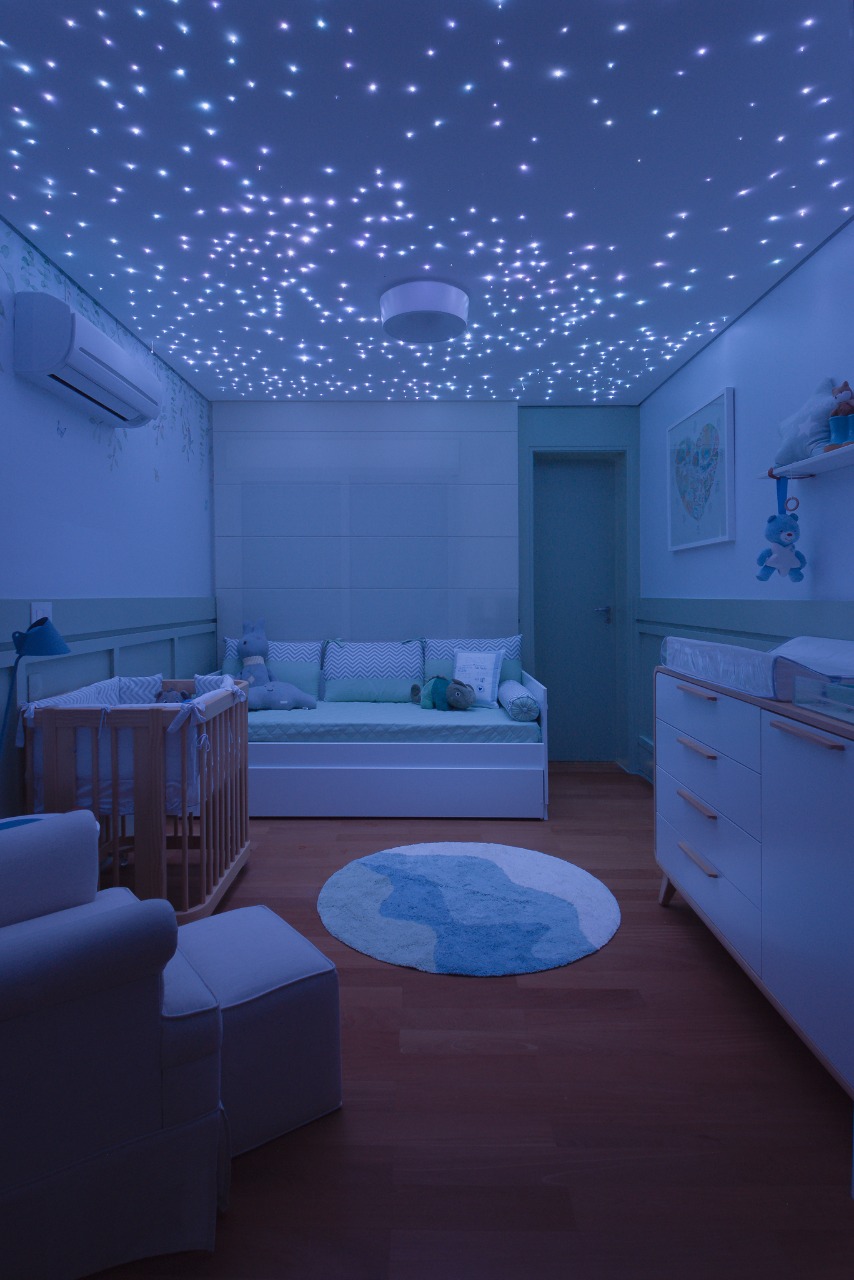 Um quarto com muita personalidade, feito pela Nível 3 Arquitetura para a influencer Carol Janini. Pintura laqueada no barrado, adesivamento de paredes e ar condicionado e execução do céu estrelado.