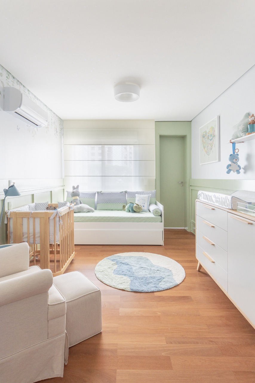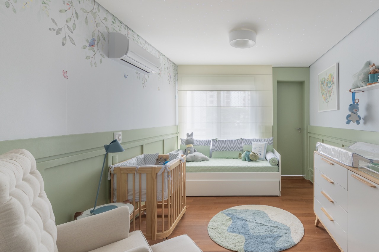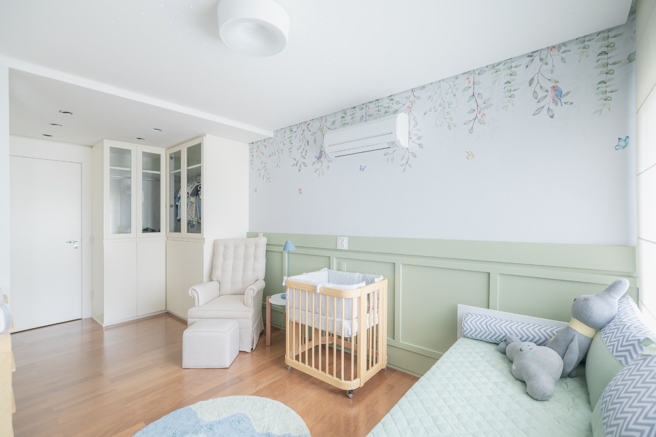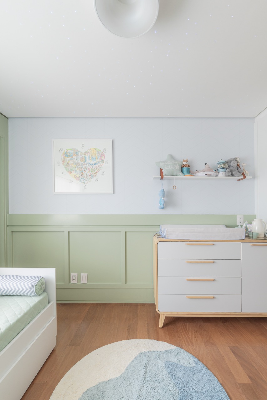 Um quarto com muita personalidade, feito pela Nível 3 Arquitetura para a influencer Carol Janini. Pintura laqueada no barrado, adesivamento de paredes e ar condicionado e execução do céu estrelado.